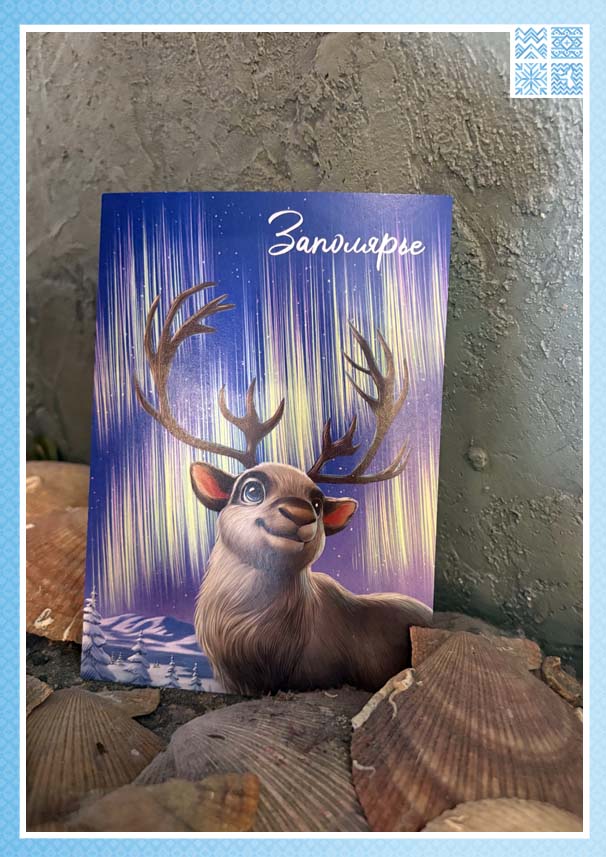 Классика северной эстетики: В сюжете собраны все ключевые атрибуты Заполярья (олень, сияние, ёлки, снег), что делает открытку узнаваемым и любимым сувениром.