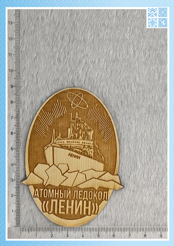 Центр: Чёткий, динамичный силуэт ледокола «Ленин», взламывающего ледяные поля. Контуры льдин выходят за пределы овала — эффект, который легко и точно реализуется лазером.