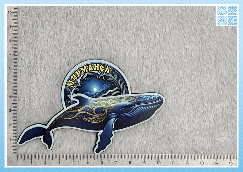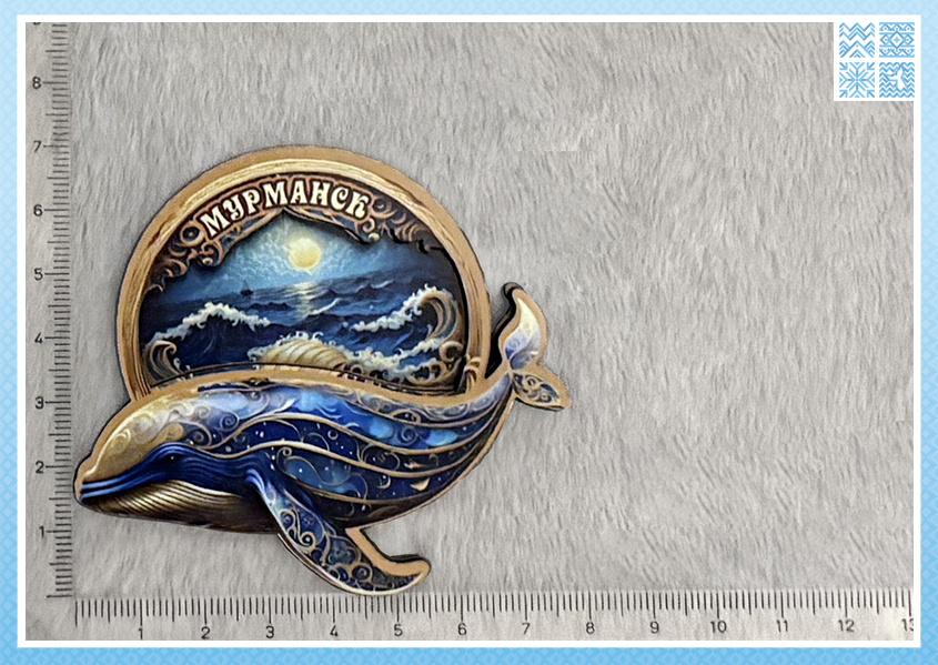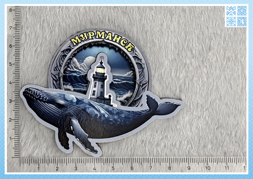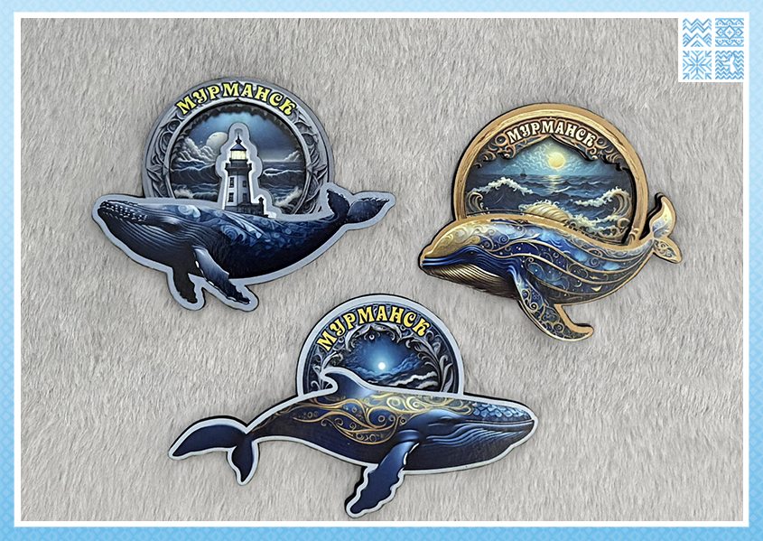 Разнообразие: В коллекции представлены разные киты (горбач, синий кит) с разными орнаментами, а также вариации фона (спокойное море, волны, с маяком). Длина магнитов варьируется от 6 до 10 см, что соответствует разным размерам «китов».