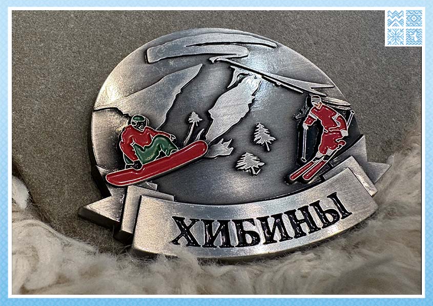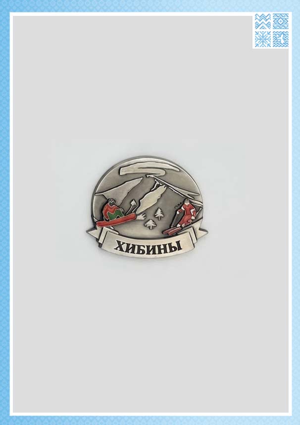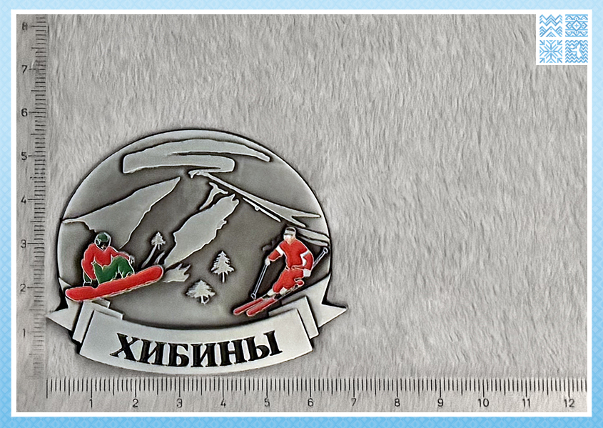 Магнит дышит зимним адреналином, скоростью и радостью от покорения склонов. Это не просто вид на горы, а воплощение активного отдыха, для которого Хибины и знамениты. Подпись внизу «Хибины» чётко указывает на место действия.